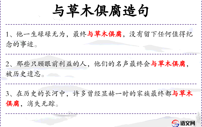 1. 【与草木俱腐】 俱:全,都。和草木一起腐烂。形容人生前无所作为,死后也默默无闻。