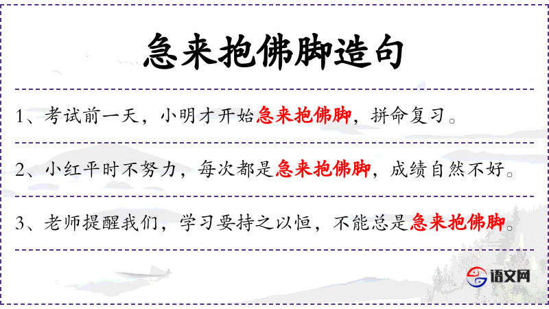 “急来抱佛脚”是一个成语,源自文化,比喻平时不努力,临时才想办法。这个成语反映了**人对于勤奋和持续努力的价值观念。