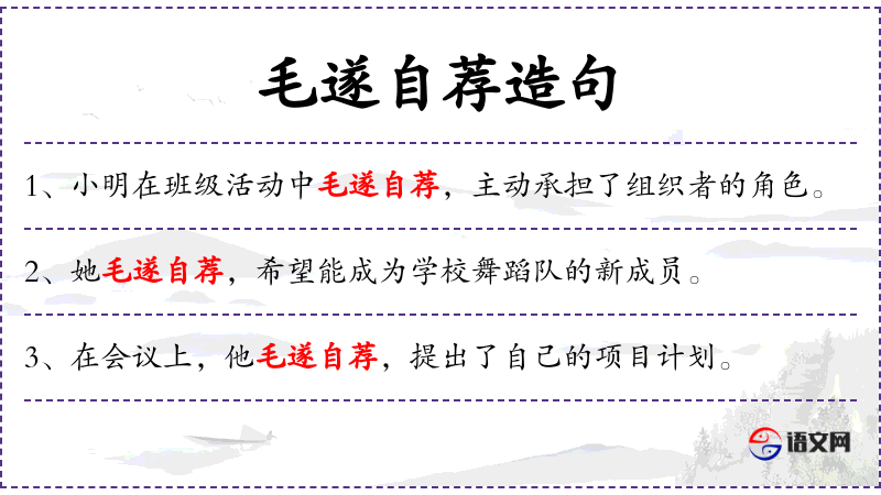 1. 【毛遂自荐】 - 毛遂自我推荐。比喻自告奋勇,自己推荐自己担任某项工作。
