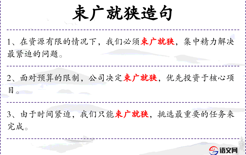 5. 【束广就狭】 指把丰富的内容概括为极少的文字。