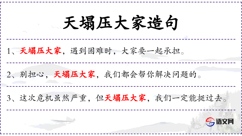 句子中的“天塌压大家”是一个成语,比喻无论发生什么困难,大家都一起承担。这个成语体现了文化中强调集体主义和团结合作的价值观念。