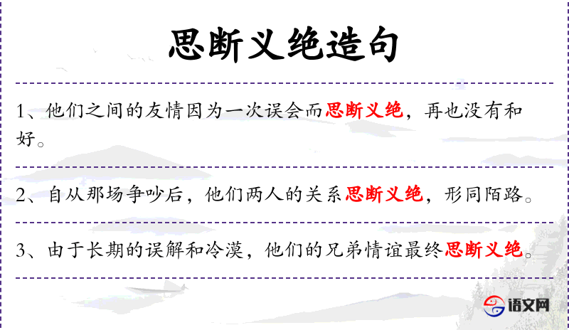 - 思断义绝:思想上断绝,道义上决裂,形容关系彻底破裂。