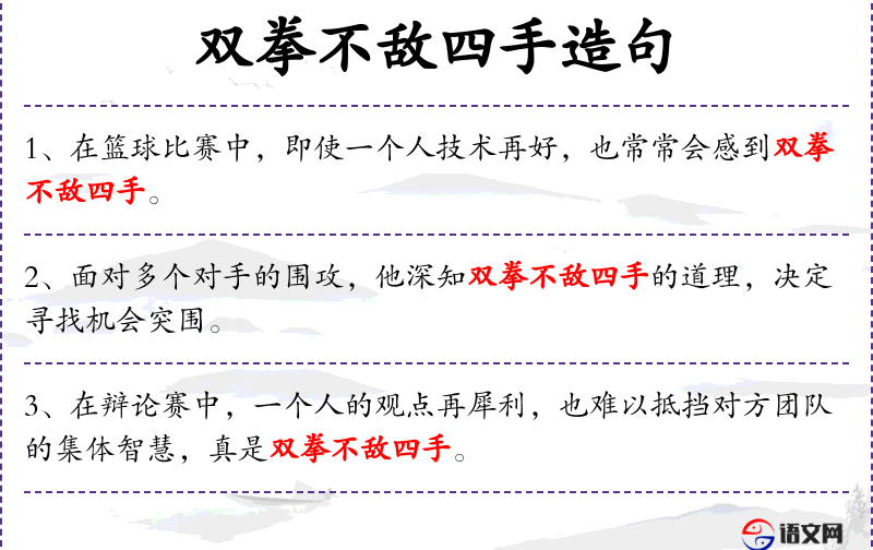 - 宾语:双拳不敌四手的道理、寻找机会突围