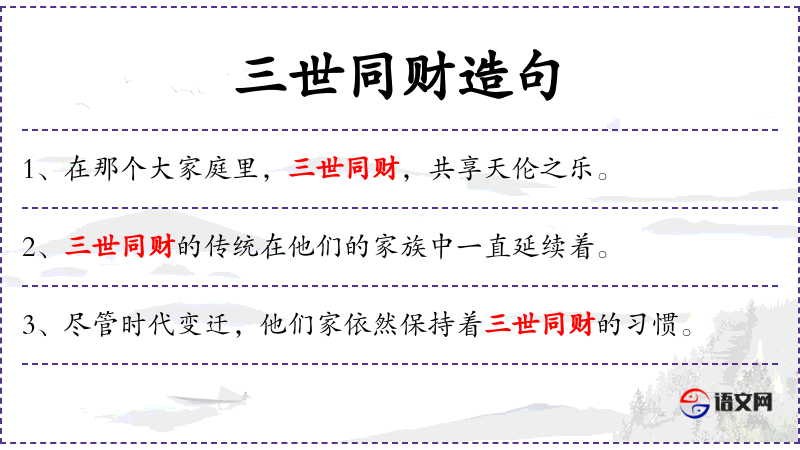 2. 【三世同财】 谓三代人和睦共居,不分家产。
