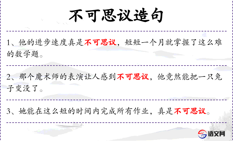 - 不可思议:难以置信、匪夷所思、出乎意料