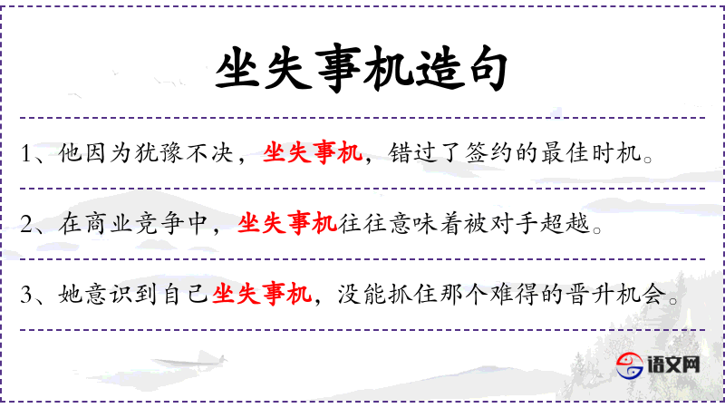 - 坐失事机:指因为犹豫或不果断而错失了机会。