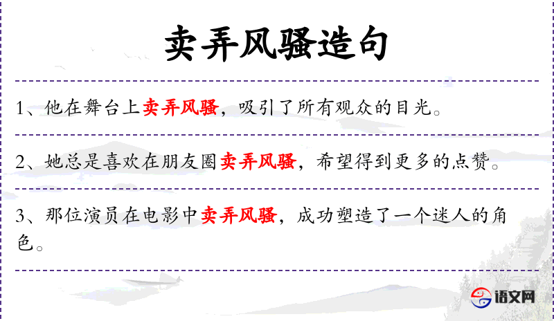 - 派对上:介词短语,表示地点。 *. 卖弄风骚:动词短语,表示故意展示自己的魅力以吸引注意。