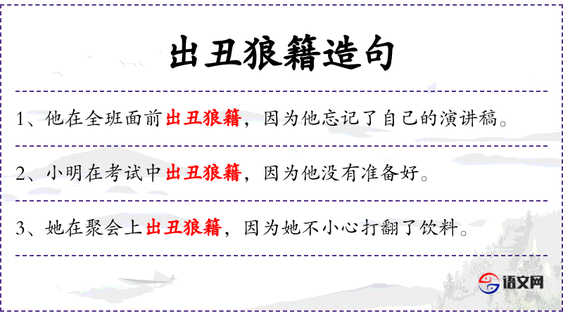 - 出丑狼籍:这个词组意味着在公共场合表现得非常糟糕或尴尬。