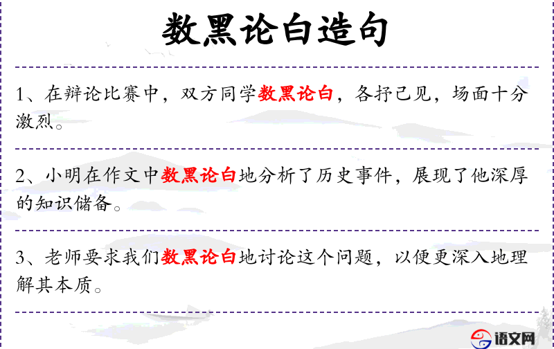 - 数黑论白:成语,意为辩论是非,争论对错。