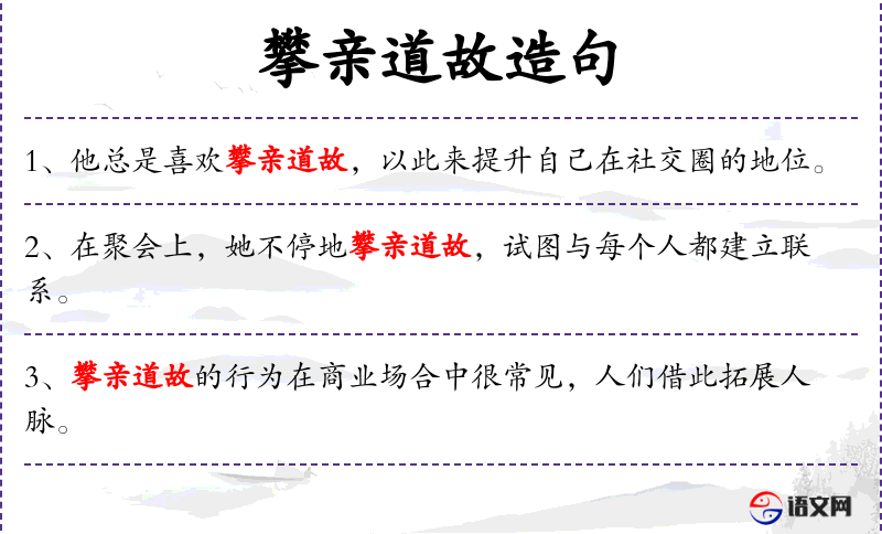 - 攀亲道故:指通过建立亲戚或朋友关系来拉近彼此的关系。