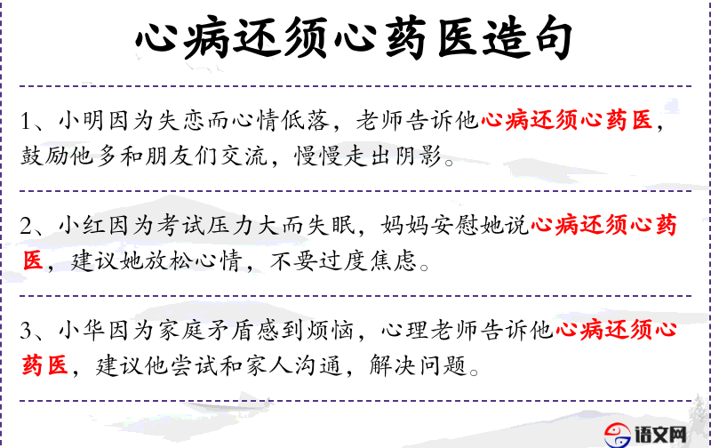 - 心病还须心药医:成语,意为心理问题需要心理方法来解决。 *. 鼓励:动词,指给予支持或激励。