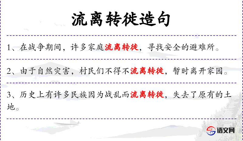7. 【流离转徙】 流离:流转离散;徙:迁移。辗转迁移,无处安身。