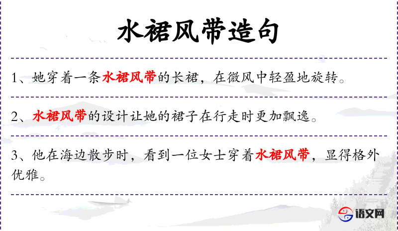 1. 【水裙风带】 - 形容舞衣的飘动。