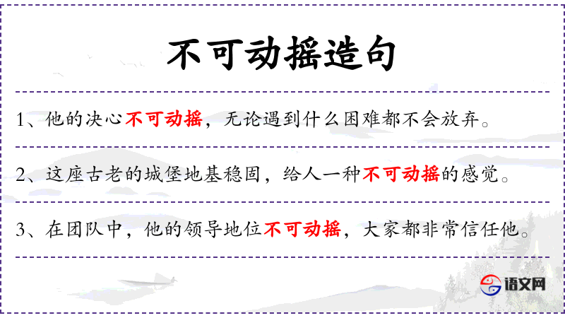 - 不可动摇的:形容词,表示坚定不移、不可改变的。