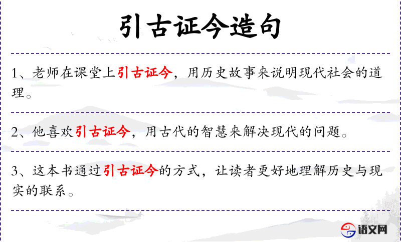 - 引古证今:动词短语,表示引用古代的事例或理论来证明现代的观点。