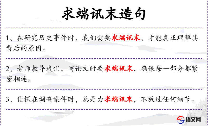 3. 【求端讯末】 - 求寻求;讯:询问;端:开始;末:结果。寻求事情的起源,询问事情的结果。形容办事态度十分严肃认真。