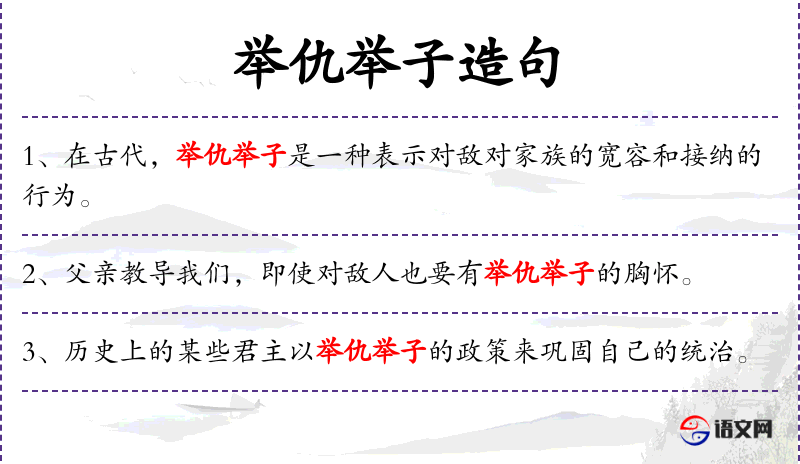 2. 【举仇举子】 举:推荐;仇:仇敌;子:儿子。既推荐仇敌,也推荐儿子。形容办事公正。