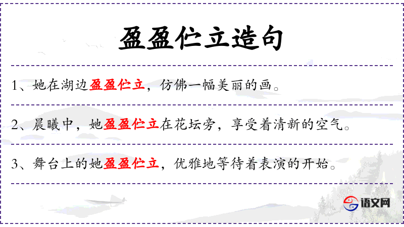 4. 【盈盈伫立】 - 盈盈:仪态美好的样子;伫立:长时间地站立。体态优美的女子长问题时站立着。