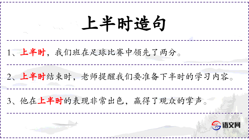 足球、水球等球类比赛,全场比赛分作两段时间进行,前一段时间叫上半时。也说上半场。