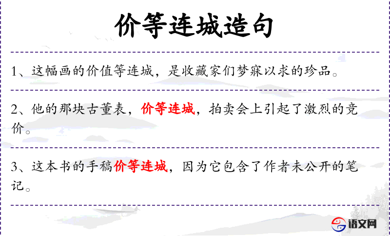 - 价等连城:这个成语源自**古代,形容物品价值极高,如同连城之宝。