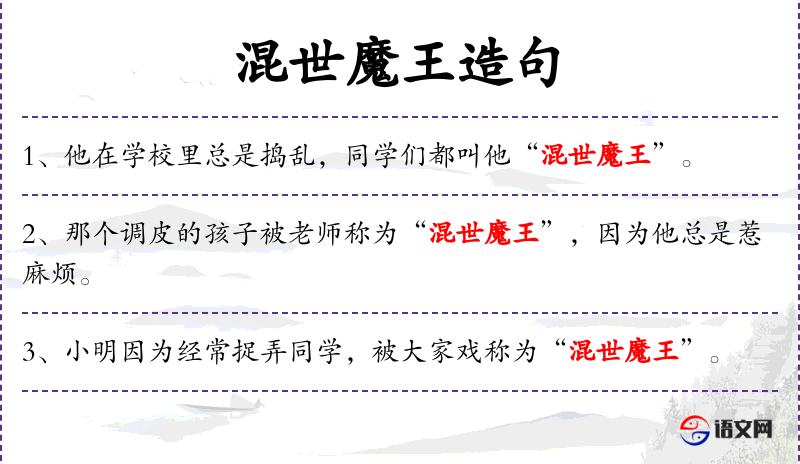 1. 【混世魔王】 - 《西游记》中的一个妖怪。比喻扰乱世界、给人们带来严重灾难的人。有时也指成天吃喝玩乐、到处胡闹的有钱有势人家的子弟。