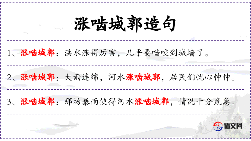 涨:涨水;啮:咬;城:内城的墙;郭:外城的墙。指洪水上涨,冲击城墙。