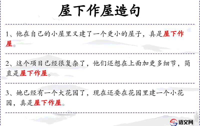 - 文化背景中,“屋下作屋”这个成语体现了**人对于过度修饰或不必要的添加的批评态度。