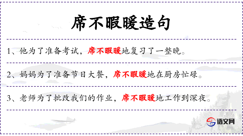 - 成语:席不暇暖,源自《左传·宣公十五年》,形容非常忙碌。