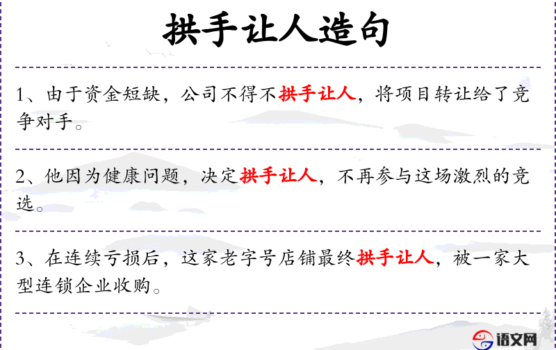 拱手让人:这个成语源自**古代的礼仪,表示恭敬地让出或放弃。在这里,它体现了小球队对强大对手的尊重和无奈。