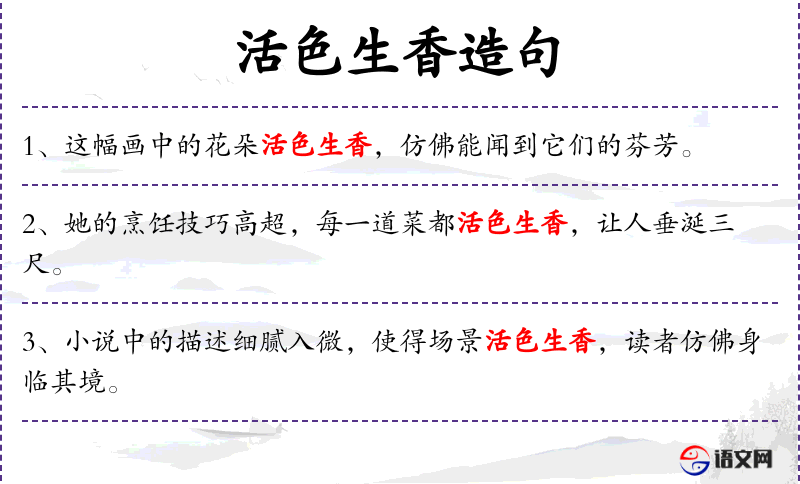 2. 【活色生香】 - 书面上呈现活生生的景象,而且散发出香味。形容诗画所描绘的景物生动逼真。