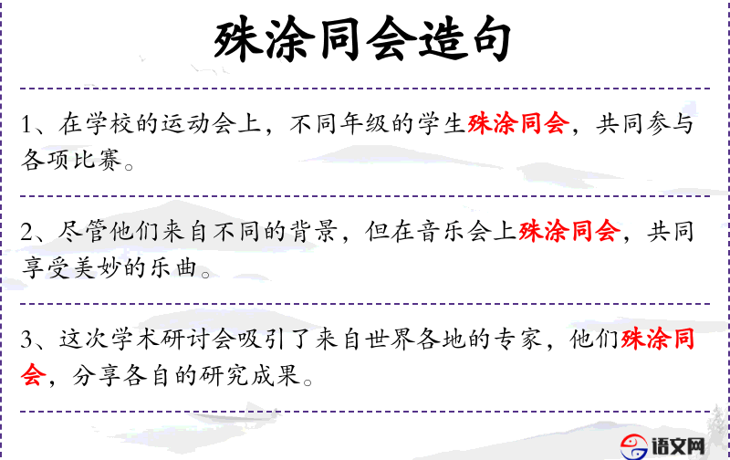 4. 【殊涂同会】 - 犹殊途同归。比喻采取不同的方法而得到相同的结果。