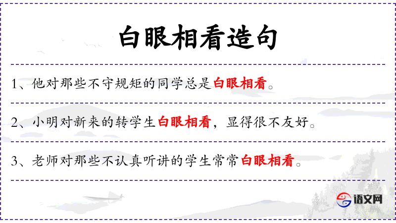 9. 【白眼相看】 看别人时眼睛朝上或旁边,现出白眼珠,表示轻蔑,不屑一顾,对人不礼貌。