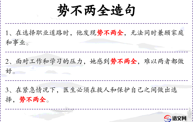- 势不两全:成语,表示在两种选择中无法兼顾。