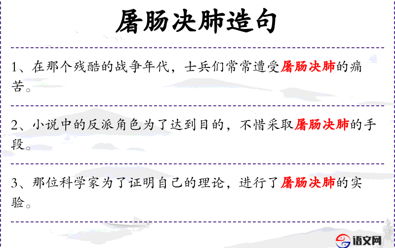 - 屠肠决肺:形容词,形容极度悲惨或残酷的情景。