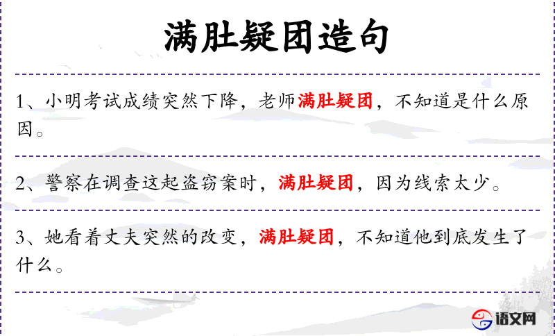 3. 【满肚疑团】 疑团:弄不清的问题。形容心里充满了疑问。