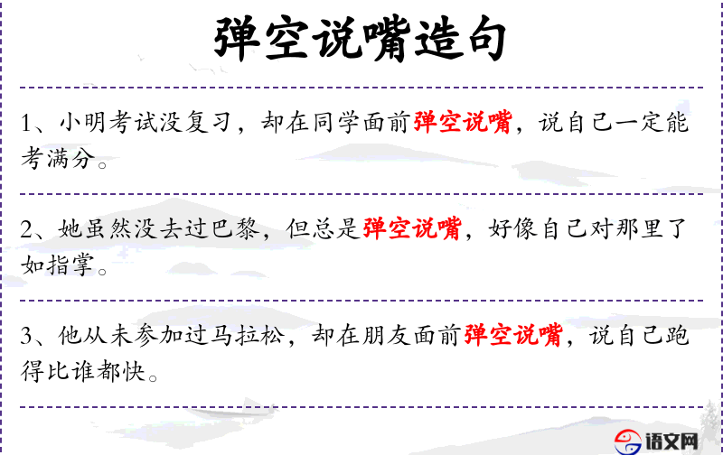 - 弹空说嘴:成语,形容没有实际经验或知识,却喜欢发表评论。