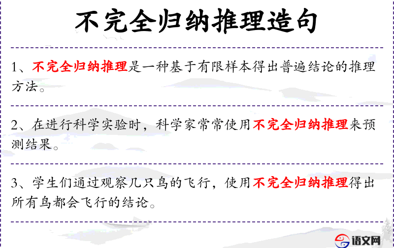 1. 【不完全归纳推理】 完全归纳推理”的对称。以关于某类事物中部分对象的判断为前提,推出关于某类事物全体对象的判断做结论的推理。在归纳推理中,完全归纳推理是不多的,不完全归纳推理则是大量的。有两种(1)简单枚举归纳推理,这是或然性推理;(2)科学归纳推理,这是必然性推理。