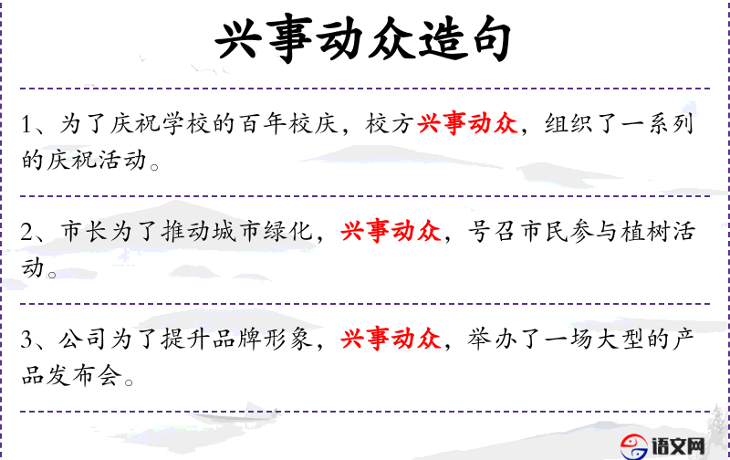 - 兴事动众:成语,意为动员很多人参与某事。