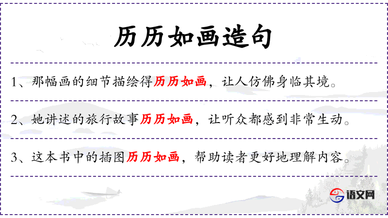 1. 【历历如画】 形容描述清楚、生动,犹如绘画一般。