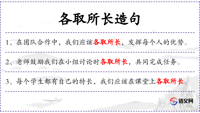 5. 【各取所长】 指要善于运用事物或人本身所具有的长处。