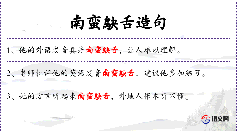 - “南蛮鴃舌”:这是一个成语,用来形容说话口音重,难以理解。其中,“南蛮”古代指南方少数民族,“鴃舌”比喻说话难懂。