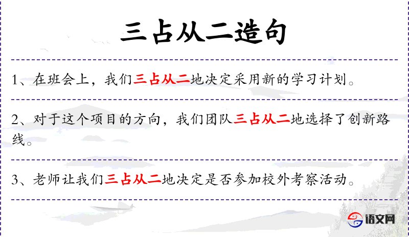 - “我们被老师要求用三占从二的方法来决定是否参与校外考察活动。”