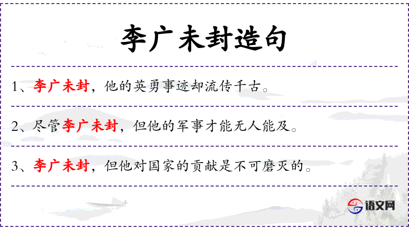 3. 【李广未封】 - 汉名将李广部下因军功而封侯的人很多,而李广本人抗击匈奴,战功显赫,却不见封侯。后因以“李广未封”、“李广不侯”、“李广难封”慨叹功高不爵,命运乖舛。
