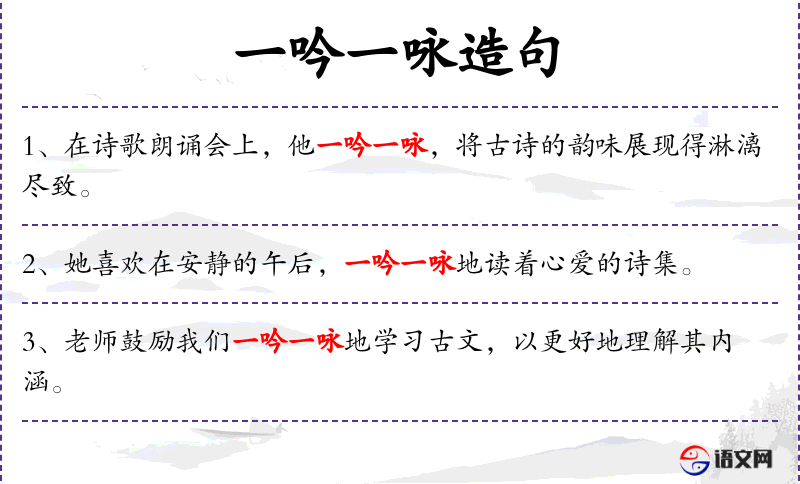 - 一吟一咏:成语,形容读书或吟诗时的悠闲和专注。