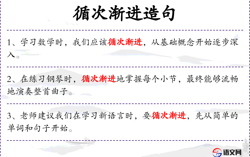 3. 【循次渐进】 循:依照。按照一定的步骤或程序逐渐推进或提高。