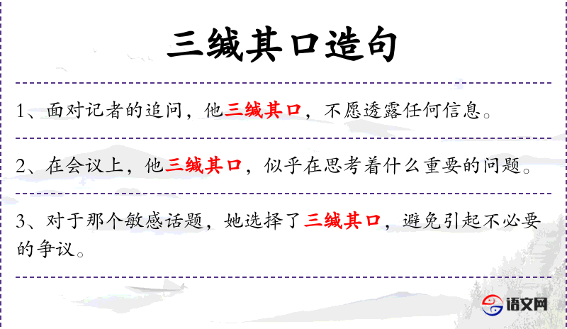 1. 【三缄其口】 缄:封。在他嘴上贴了三张封条。形容说话谨慎。现在也用来形容不肯或不敢开口。