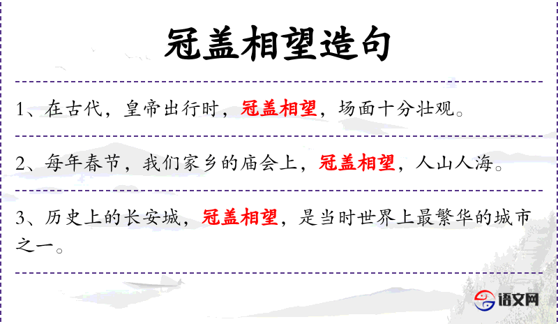 - 句子中的“冠盖相望”是一个成语,源自《左传·僖公二十五年》:“冠盖相望,车马不绝。”形容官员或贵族出行时的盛况。