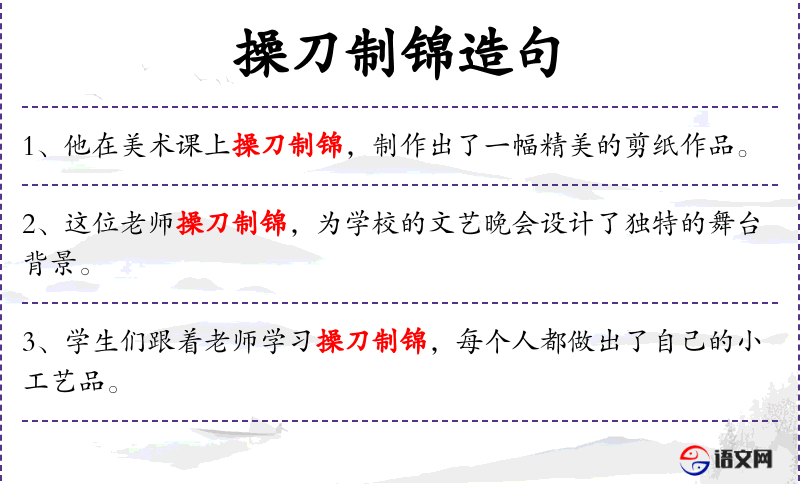 - 操刀制锦:字面意思是“用刀制作锦绣”,在这里比喻精细的手工制作。