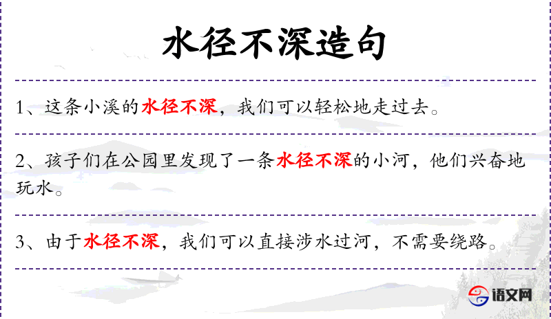 1. 【水径不深】 - 径:直,直往。水流很急的地方,水则不会深。