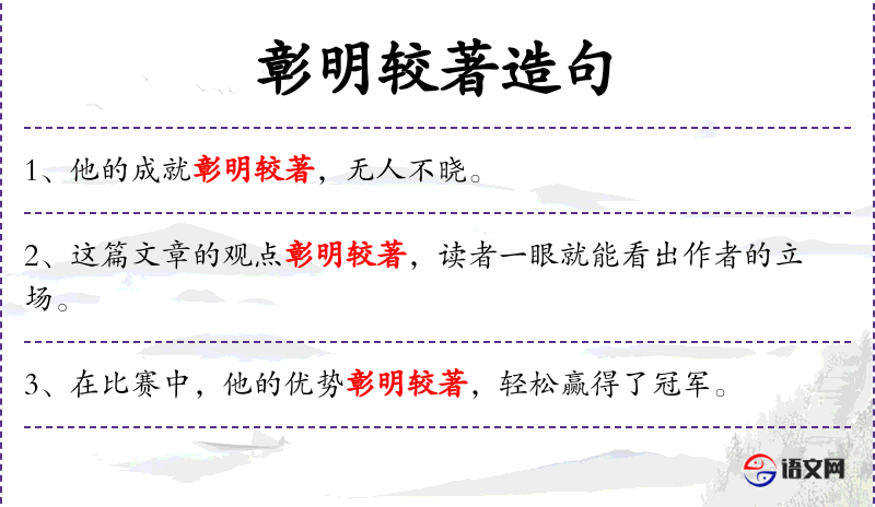 - 谓语:“彰明较著”是谓语,描述主语的状态。